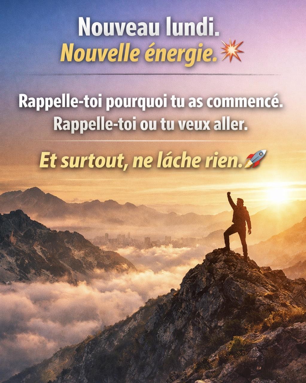 Nouveau lundi. Nouvelle énergie. 💥 Peu importe comment s’est passée la semaine dernière, aujourd’hui est une page blanche. Pas besoin d’être parfait, juste d’avancer. Même un petit pas compte. Rappelle-toi pourquoi tu as commencé. Rappelle-toi où tu veux aller. Et surtout, ne lâche rien. 🚀 Cette semaine, on construit, on progresse, on évolue. À ton rythme, mais sans t’arrêter. Let’s go. 🔥